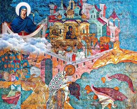 Итак, в 910-м году, блаженный Андрей пришел во Влахернский храм в Константинополе, где во время богослужения ему явилась Пресвятая Богородица. Она как бы стояла в воздухе, держа в руках мофорий или омофор (покрывало) над всеми, кто в тот момент, как и Андрей, молился в храме. Лик Богородицы и святых, явившихся вместе с ней, постепенно пропал, а вот омофор, излучающий славу Божию, еще какое-то время был распростерт над стоящими в храме.