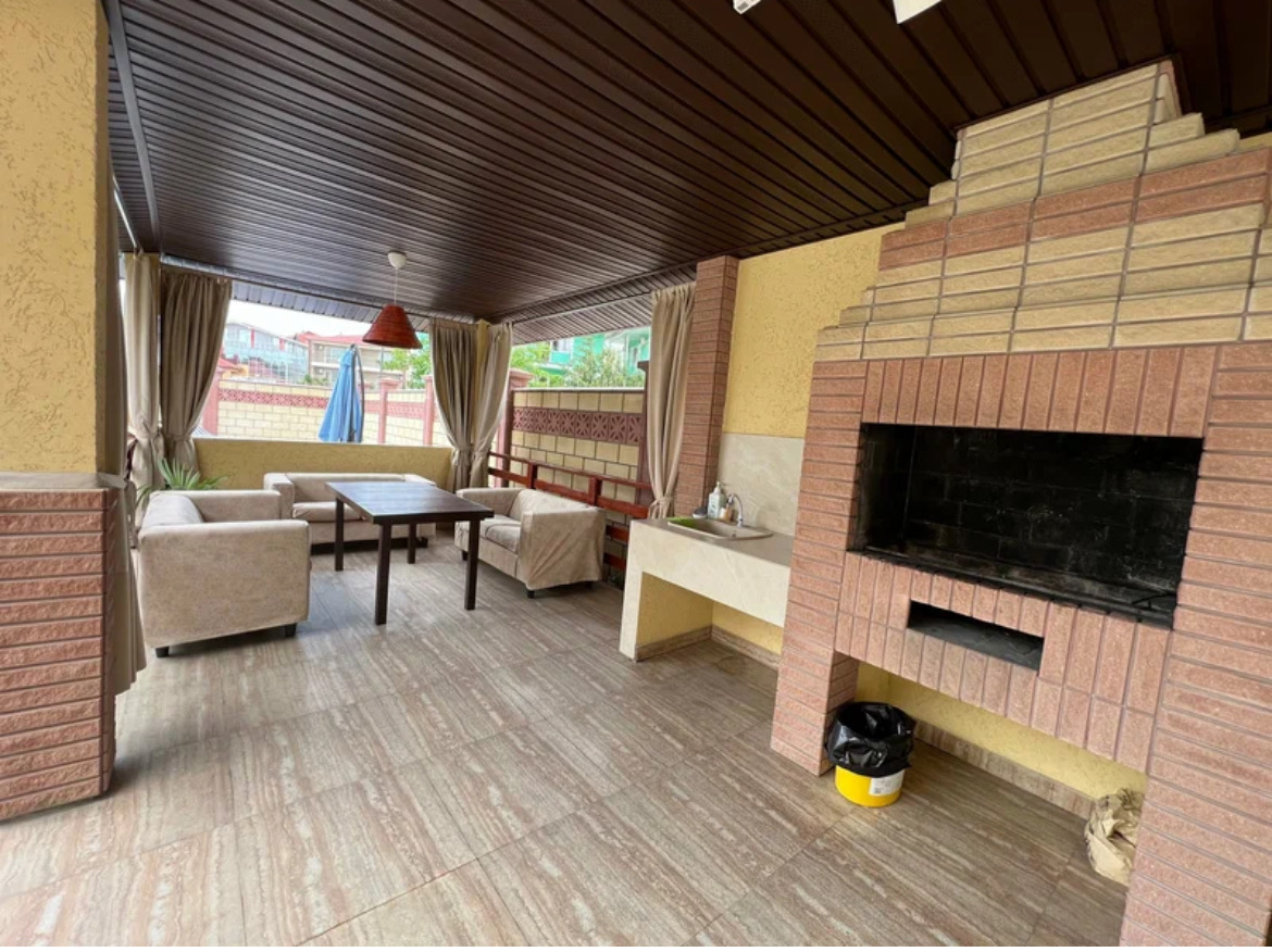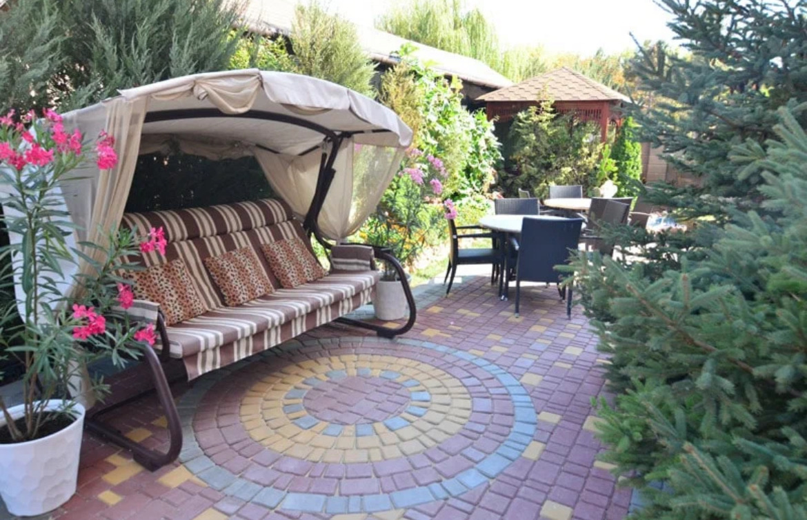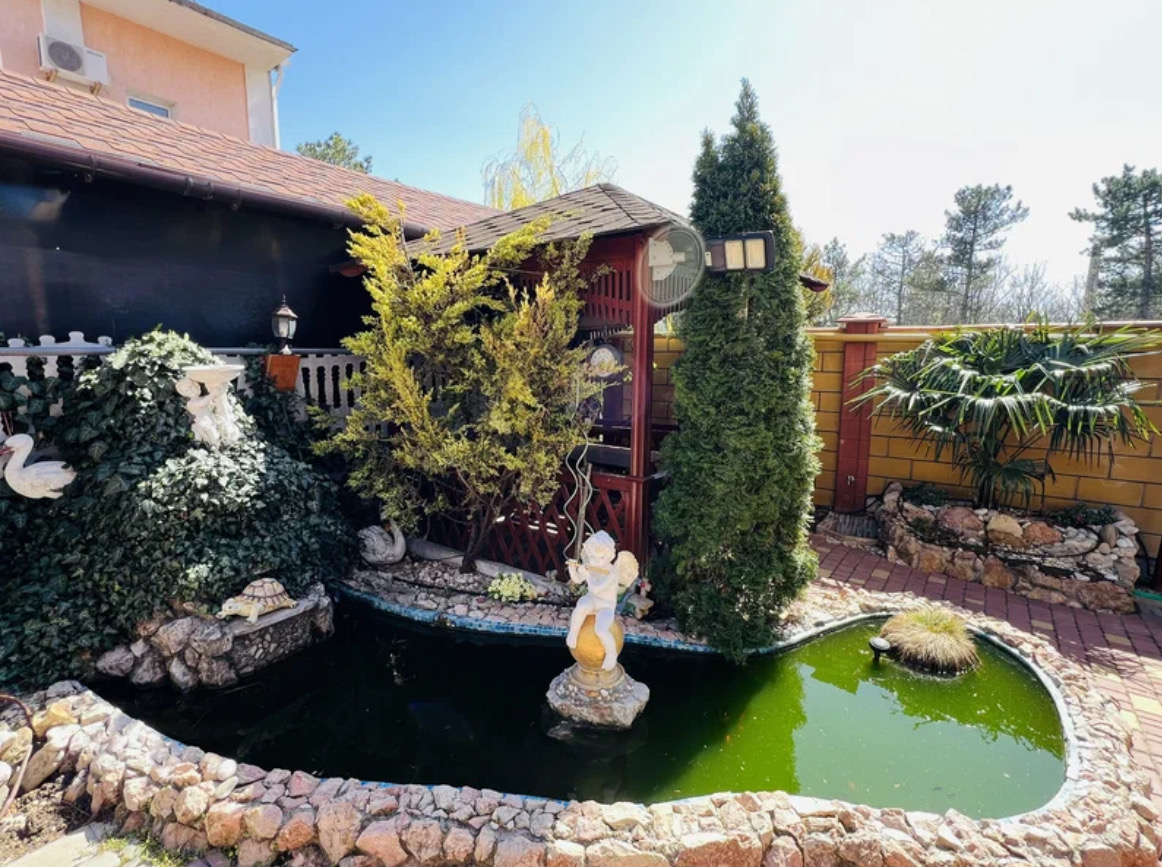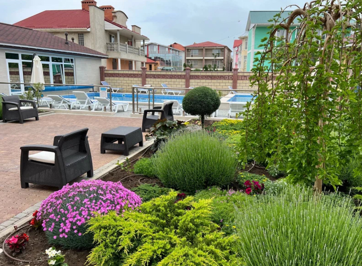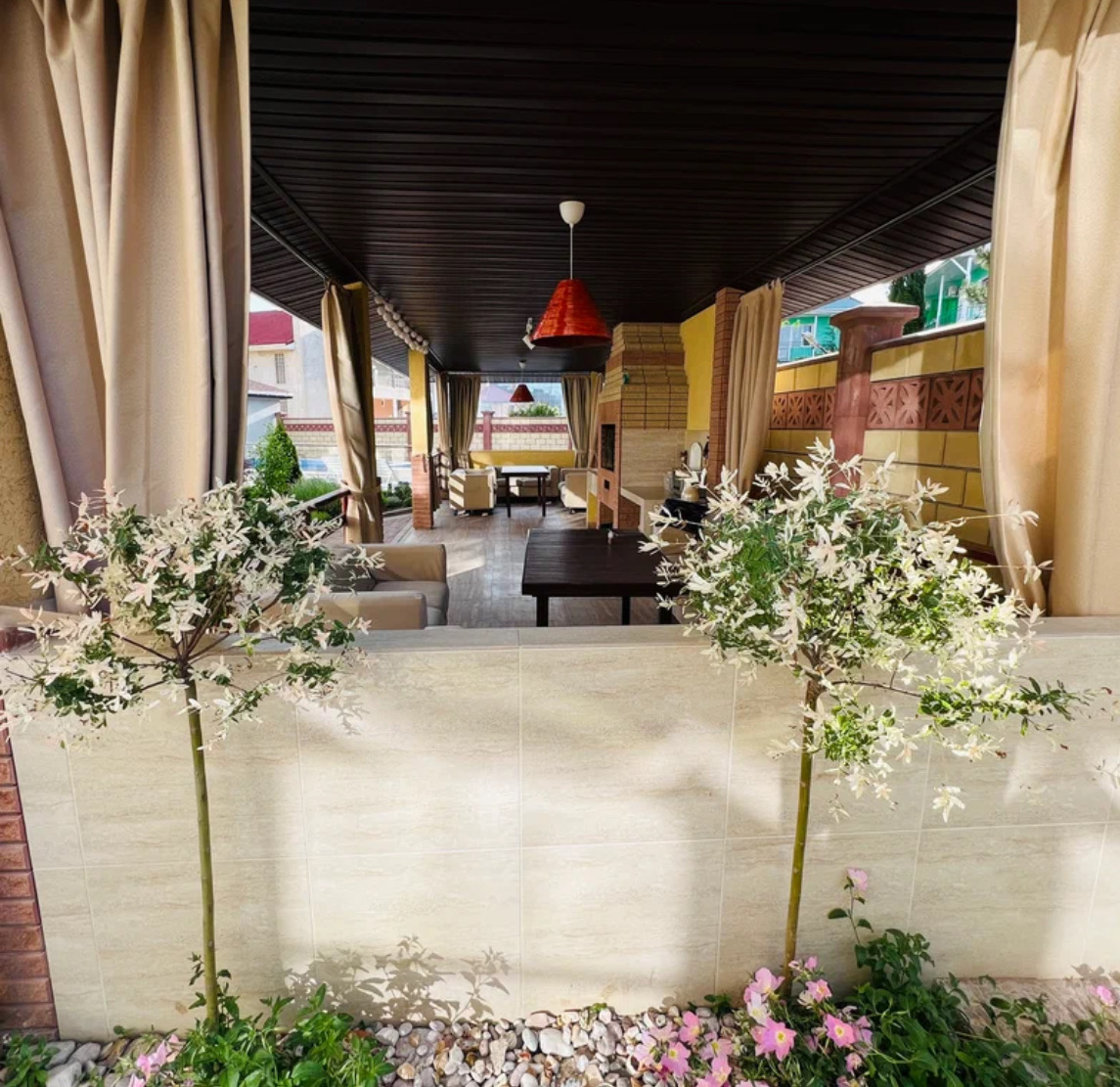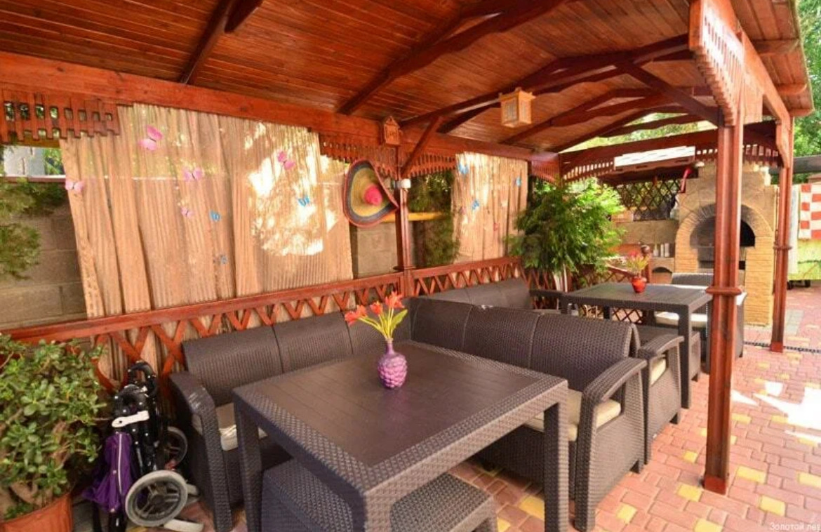 Во дворе пансионата баня, бассейн, шезлонги для отдыха, уютная беседка с мангалом, кинотеатр для детей под навесом, площадка для отдыха (Альпийская горка, качели, песочница для детей, столы и стулья под шезлонгами, настольный теннис, барбекю и др.)